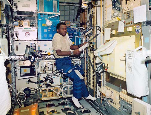 Astronaut Michael Anderson in the Spacelab module during the actual mission. If the rescue mission imagined here had taken place, the lab's equipment would have been powered down on Flight Day 5.