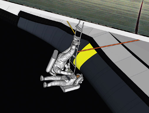 For the hypothetical repair work, Anderson and Brown use a ladder taken from the mid-deck of the crew cabin. In this illustration, the ladder hangs down from the edge of the open payload bay door, which lies four feet above the damaged wing.