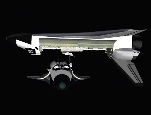 To help keep the two shuttles together as they orbit, the pilots in the scenario focus on a laser beam, seen here as a faint line extending upwards from Atlantis. To the left of this beam, two astronauts traverse along a pole extended to bridge the two ships.