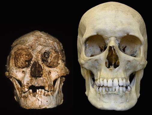 Why was the hobbit (left skull) so small? Was its ancestor who first arrived on Flores an as-yet undiscovered species that was as tiny or even tinier than it? Or was that ancestor originally big like us (right skull) and then shrank over time like certain large mammals tend to do on islands? Like so much else about Homo floresiensis, the jury is still out.